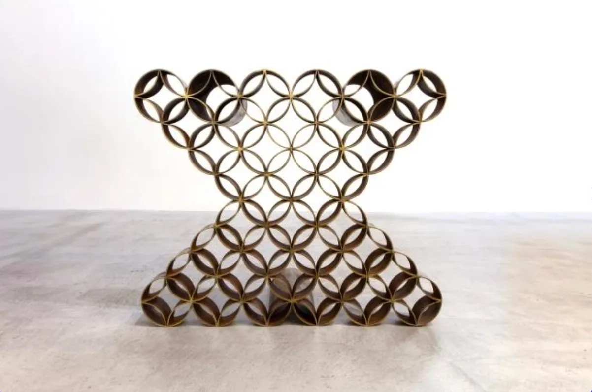 七宝柄は円形の連続構造を持ち、力を分散しやすい形状です。鉄で立体化することで、局所的な負荷にも強く、全体として高い剛性を発揮し、木製にはない耐久性、耐火性、耐重性、耐震性、防犯性を備える構造となります。また、立体的な七宝柄は光を通す構造になるため、照明や影の演出を活かせます。正面から見ると、円の「線」を強調した透過性を強調し、少し角度を変え眺めると遮蔽性が生まれた、独特の立体感を感じられます。特許で認められた独自の製造工程と構造体により、一切の溶接痕(溶接をした跡)を残さない、日本紋様として伝統的な「七宝柄」を純粋に表現することを意識した商品となります。
