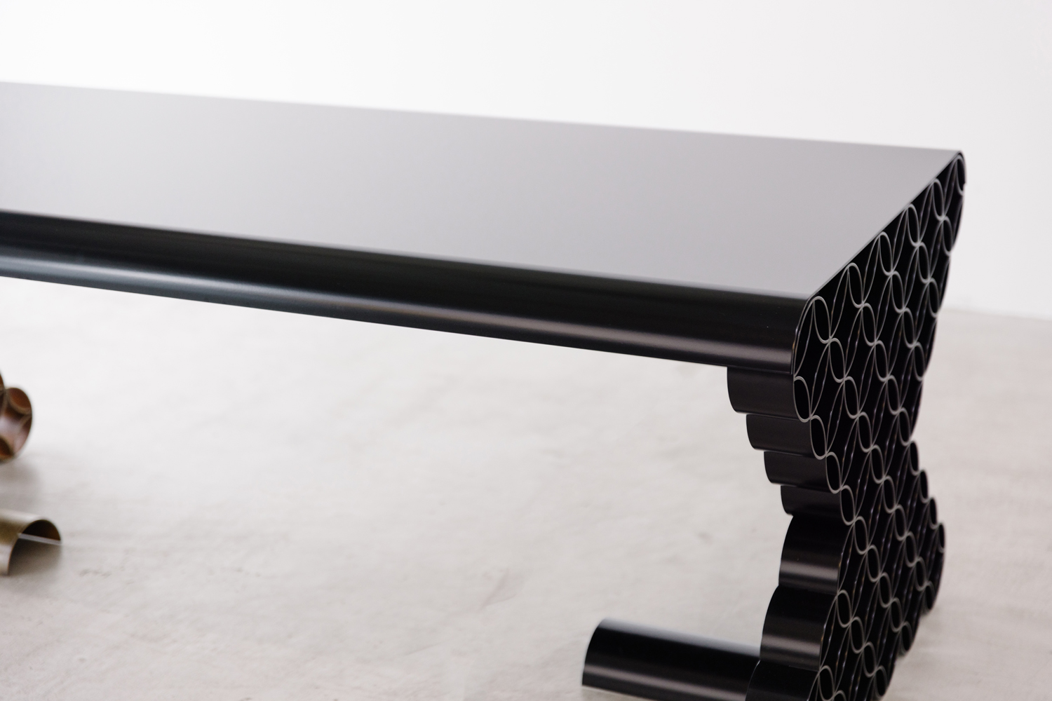 鉄板でのテーブル天板は、強度と精度、重さをカバーする意匠性を出すのが難しく、一般的にほとんど市場に出ていません。TesseHongoでは、テーブル脚の七宝柄のアールに合わせ、端部に長尺の曲げ加工を施すことによって、歪みのない堅牢な鉄製天板を実現いたしました。柄の性質に対し素直にデザインすることで、シャープな印象を避け、柔らかなラインを強調し、脚との統一感によって空間に優雅さを加えます。