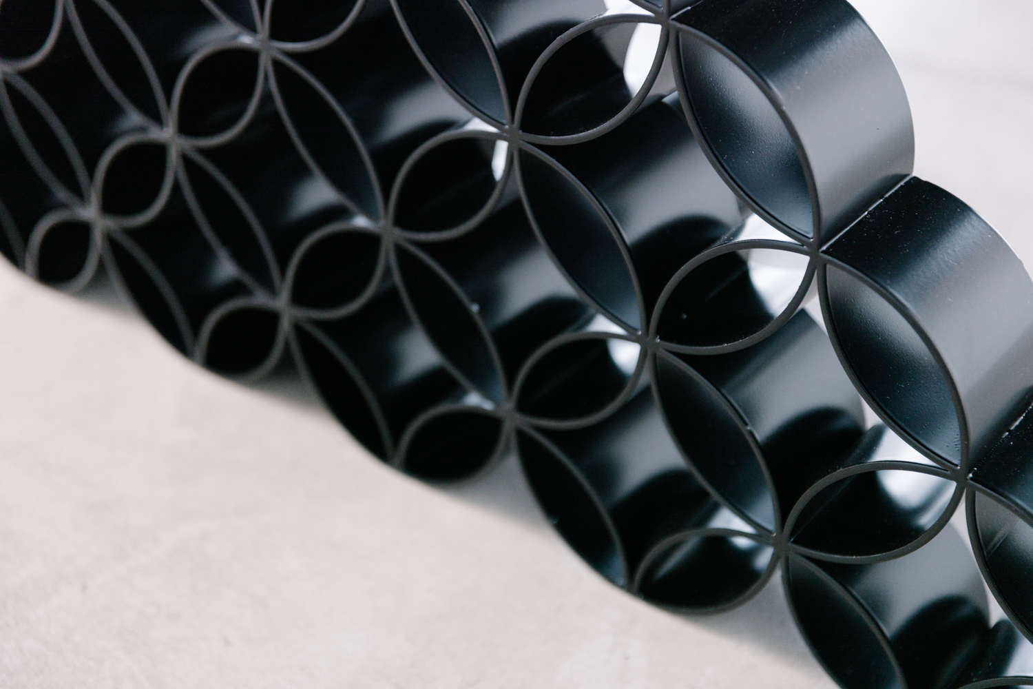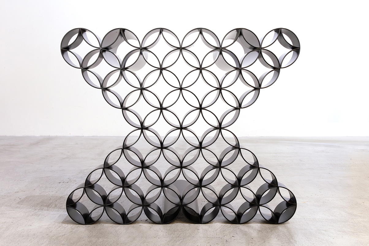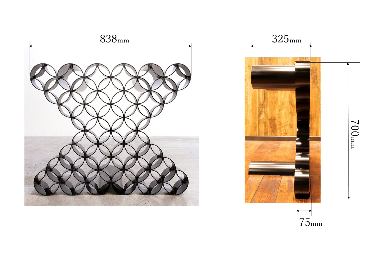 These are table legs made of iron, featuring a three-dimensional interpretation of the traditional Shippo (Seven Treasures) pattern. The circular structure is created using our patented welding-free manufacturing method, which leaves no visible weld marks. This geometric form effectively distributes force, offering superior resistance to localized loads and impacts. Unlike wood, it excels in durability, fire resistance, load-bearing capacity, and earthquake resistance. The section that supports the tabletop extends naturally from the Shippo pattern itself, preserving the aesthetic beauty of the design without interruption. This product embodies the concept of “beauty in utility,” where the structure itself becomes the design.