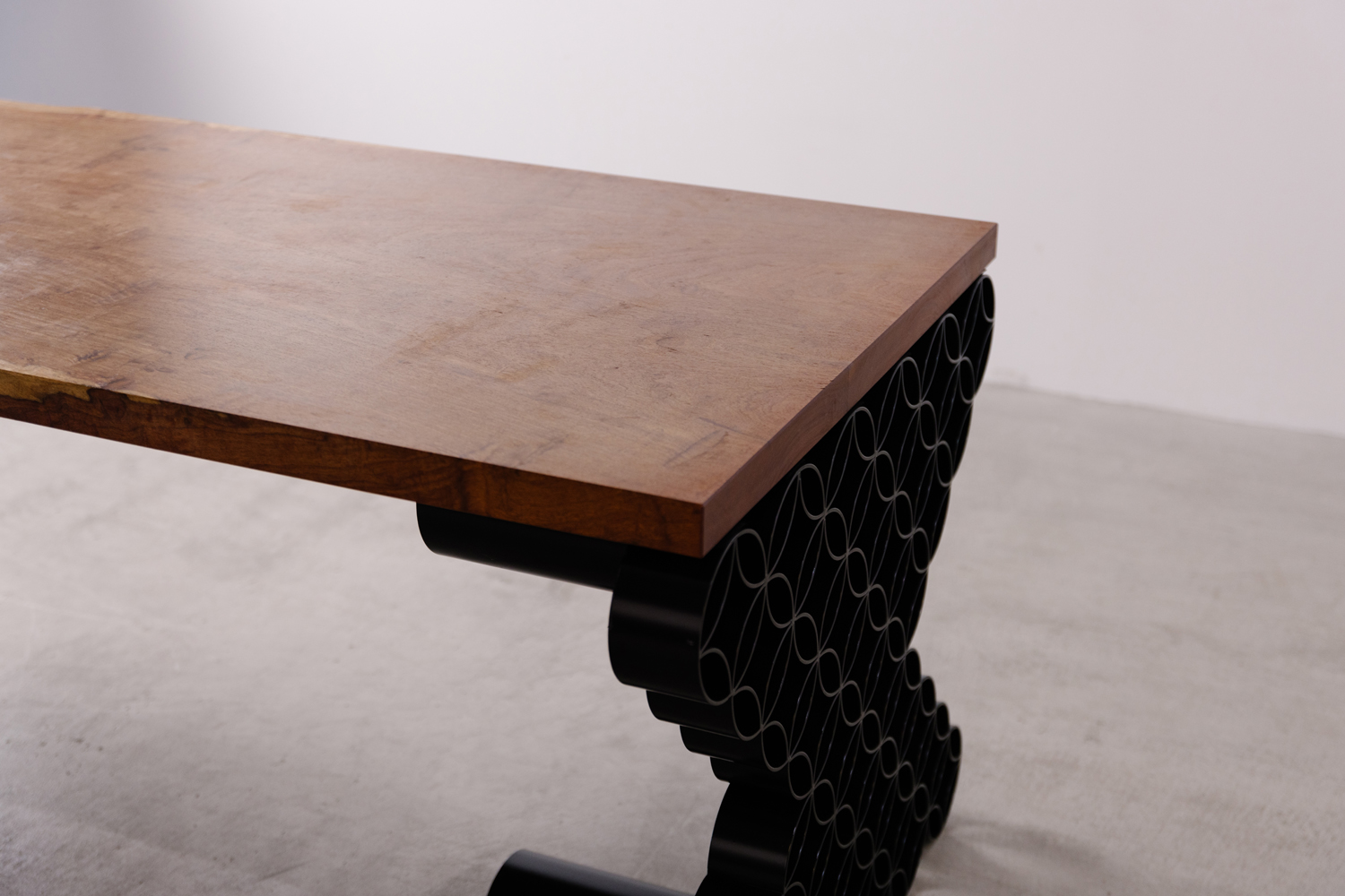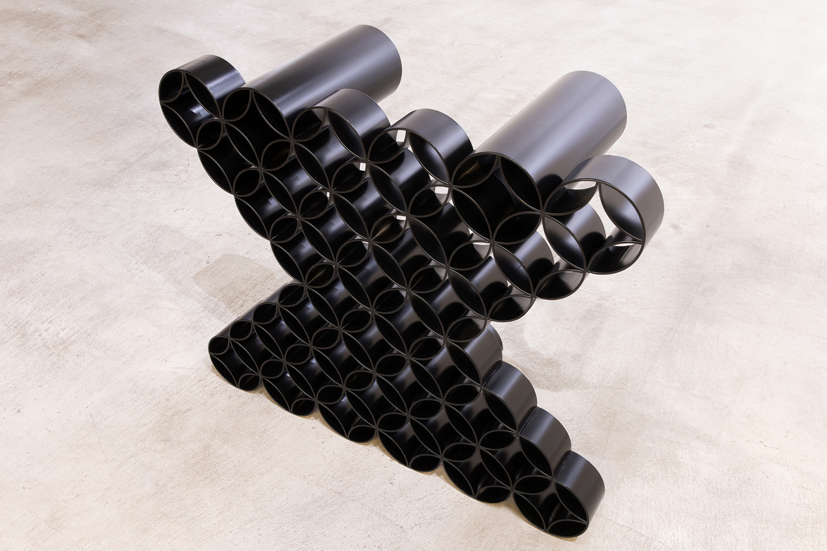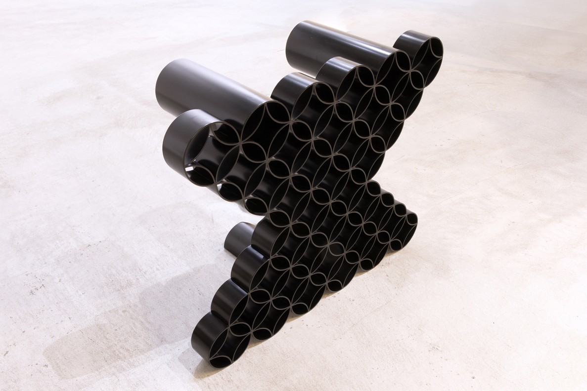 These are table legs made of iron, featuring a three-dimensional interpretation of the traditional Shippo (Seven Treasures) pattern. The circular structure is created using our patented welding-free manufacturing method, which leaves no visible weld marks. This geometric form effectively distributes force, offering superior resistance to localized loads and impacts. Unlike wood, it excels in durability, fire resistance, load-bearing capacity, and earthquake resistance. The section that supports the tabletop extends naturally from the Shippo pattern itself, preserving the aesthetic beauty of the design without interruption. This product embodies the concept of “beauty in utility,” where the structure itself becomes the design.