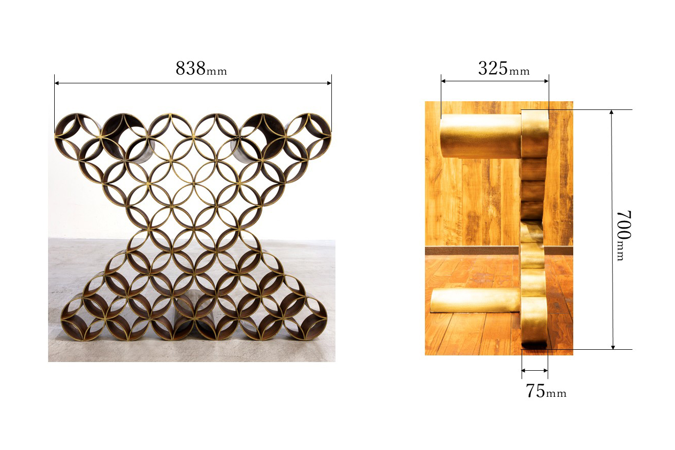 These are table legs made of iron, featuring a three-dimensional interpretation of the traditional Shippo (Seven Treasures) pattern. The circular structure is created using our patented welding-free manufacturing method, which leaves no visible weld marks. This geometric form effectively distributes force, offering superior resistance to localized loads and impacts. Unlike wood, it excels in durability, fire resistance, load-bearing capacity, and earthquake resistance. The section that supports the tabletop extends naturally from the Shippo pattern itself, preserving the aesthetic beauty of the design without interruption. This product embodies the concept of “beauty in utility,” where the structure itself becomes the design.